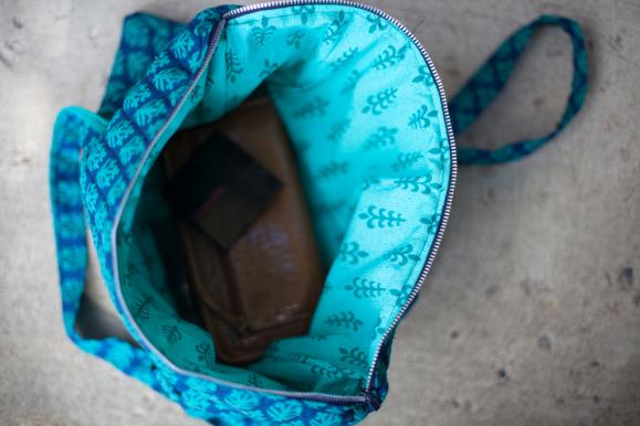 Carefully turn the bag inside out, making sure to push the corners out. Hand-stitch the lining hole closed. Open the zip, and unpin the handles out. Your bag is now ready to use! Drop your wallet in, and some lip gloss and you should be all set!