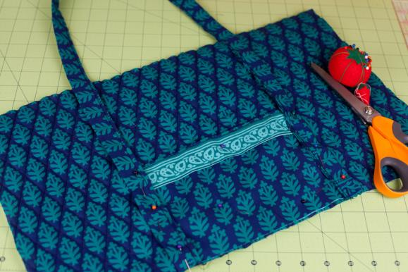 Now it’s time to attach the pocket to the front of the bag. Pin the pocket onto the center of the bag and pin the front handle to sit on top of it. Place the handles 5.25 inches in from each of the outer edges. Sew the handle and pocket in place. Similarly sew the handle in place on the back of the bag.