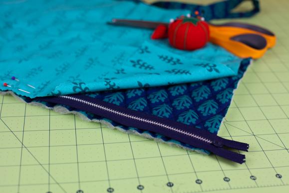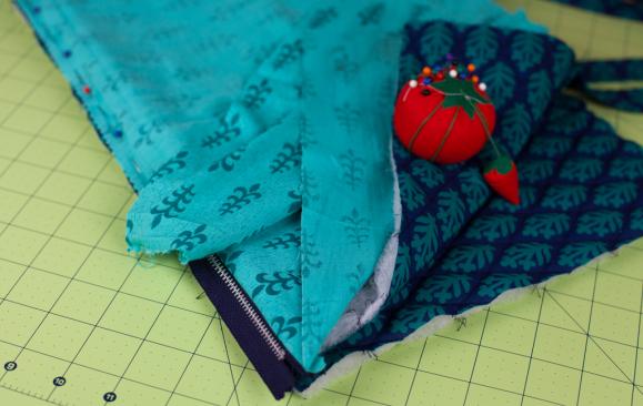 Now the bag should have a little structure. Open the bag out, so that the lining pieces are on one side of the zip and the quilted front and back are on the other side. Take a minute here, to pin your handles securely, so that you don’t accidently get them stitched into the bag seams.