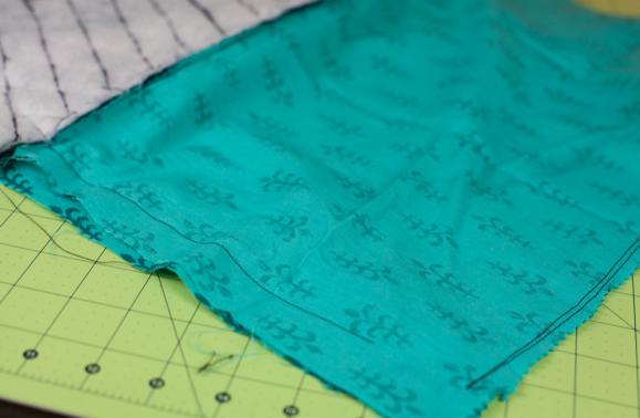 You will also need one rectangle to form the pocket measuring 5 by 7 inches (plus seam allowances). I finished the inside of the pocket with a contrasting fabric, and added a pretty border on top here