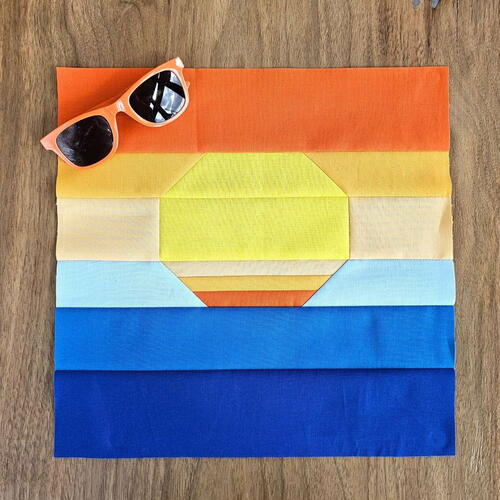 The Ocean Sunset Quilt Block captures the serene beauty of a summer sunset over the sea. This block features a gradient of dark oranges and yellows into deep blues, mimicking the sky's transformation as the sun sets. A circular sun motif sits in the center of this 12-inch block, finishing the design. The block’s harmonious and soothing colors make it ideal for creating quilts that reflect the peaceful and captivating ambiance.