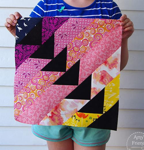 A square in a square in a block is easily transformed into something more modern and complicated by choosing the right fabric. You can go with a monotone look with just two colors or use up tons of gorgeous fabric for a bright and bold look like the example below.