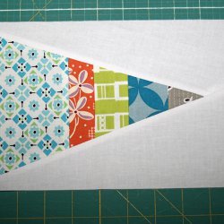 Use these scrap quilt blocks to make triangle quilts. Piece together an isosceles triangle with strips of scraps, then add two white triangles to each side to create a rectangular triangle block. Put them all together and your finished quilt will look like colorful, evenly spaced triangles against a field of white.
