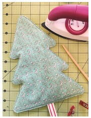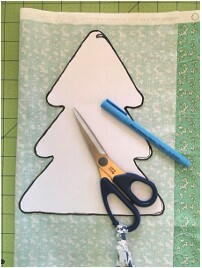 Print out Tree template and cut out tree shape. Take two green fabrics 8x10 inches and place together right sides facing, pin to hold in place, using a pen or marker trace the template onto your fabric. Your pen marking will be your sew line, do not cut on this line! Use a scissors to cut ¼ inch around your sew line. Follow these steps using two sheets of Insul-Bright to cut your lining.