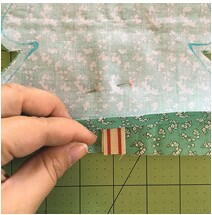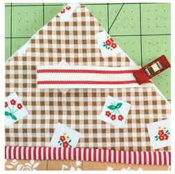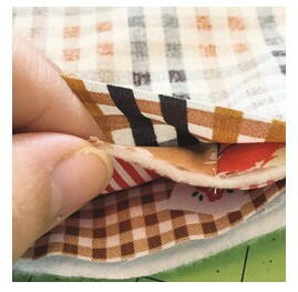 To sew together, layer Insul-Bright, roof fabric, house front pocket (both right sides up), and lastly place house backing fabric right side down on top, use clips to hold in place.
