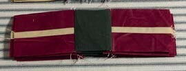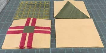 Stitch second red strip to opposite side of cream fabric. Press again to the red fabric. Square should then be a red/cream/red piece.