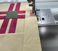 To finish the quilt after all embroidery is complete, switch machine back to sewing mode. Select the “home” at the bottom of the screen, then touch the “t-shirt” to enter into techniques. At the bottom of the techniques screen choose the “Quilting, RW, VZZ” option, then Ruler Work, Free Motion, or Straight stitch depending on desired method for finishing. Finished photos of quilt reflect a combination of Free Motion and Ruler Work to Complete.