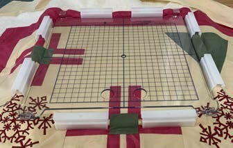 On blank blocks, find center of block and mark with a fabric marking pencil or pen. Center marked spot in the middle of hoop, using plastic template to find center location. Once placement has been found, secure fabric in hoop using magnetic clips as shown. Remove plastic template before transferring to the machine.