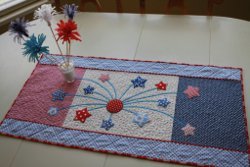 The Fireworks in the Kitchen Quilted Table Runner is a quick and easy way to decorate your kitchen or patio for Independence Day. This free quilted table runner pattern features a firework display with fabric applique stars and simple graphic piecework. Allover stipple quilting makes the fireworks pop, while diamond lattice quilting defines the table runner's borders.