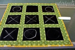 The Tic Tac Toe Play Mat is a clever way to use chalkboard fabric in a kids' quilt pattern. Piece nine squares of chalk cloth together separated by sashing and quilt to batting and backing to create a reusable play mat for tic tac toe. This quilt can also be used for drawing and coloring to entertain several kids at once. This makes the Tic Tac Toe Play Mat great for traveling and rainy days!