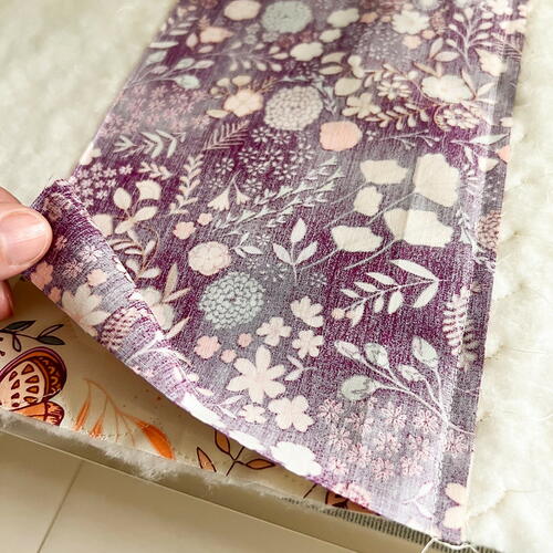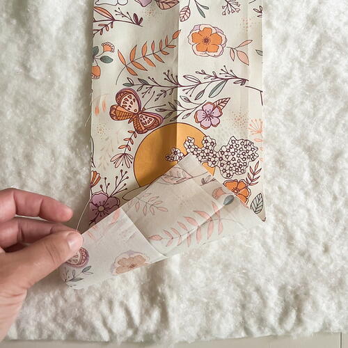 Begin by taking the 11" x 30" piece of cotton batting and mark the center either by folding it in half to create a crease or by marking with a water-soluble pen. Now take the 5.5" x 11" main Fabric 1 piece for the journal and mark it with a center crease. Using the crease folds or markings, center the fabric onto the center of the batting with the fabric facing right side out. If needed, spray baste, or pin baste the fabric in place to the cotton batting.