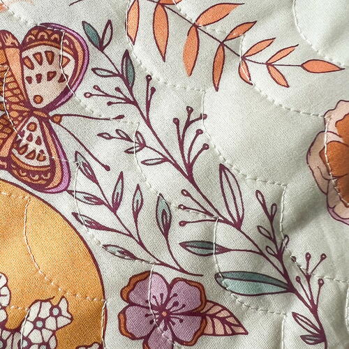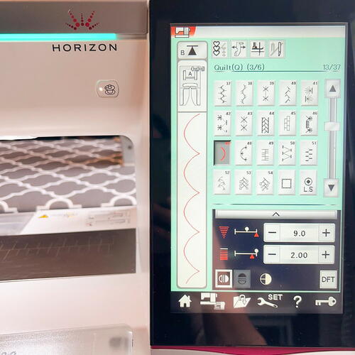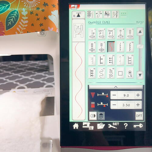 Again, quilt to attach the fabric to the batting. This time I used the wavy quilting stitch set at a width of 9.0 and a length of 3.5.