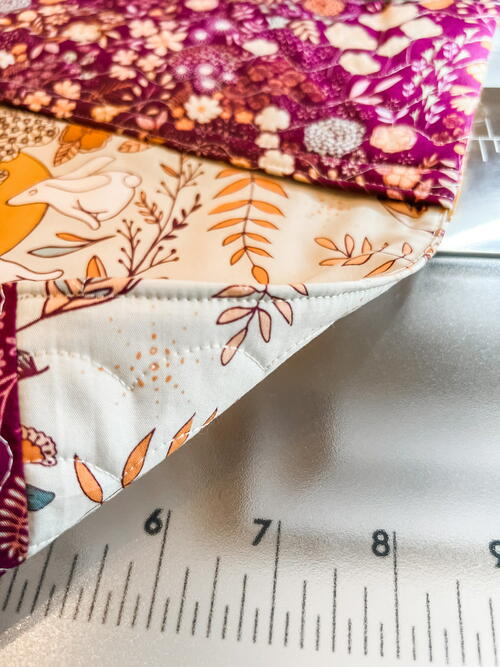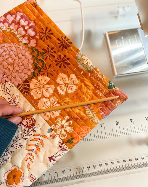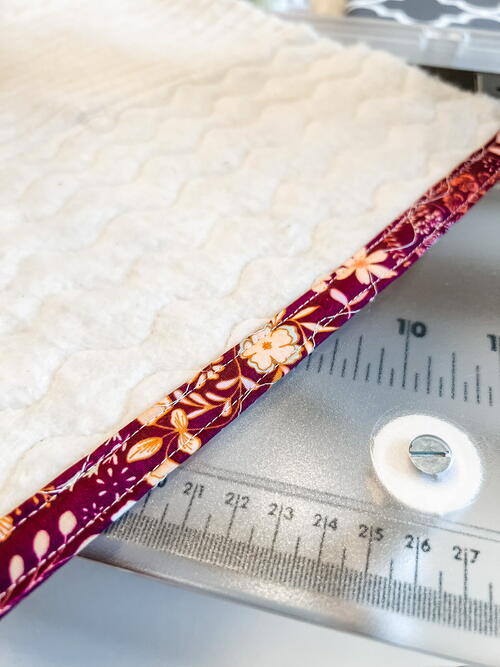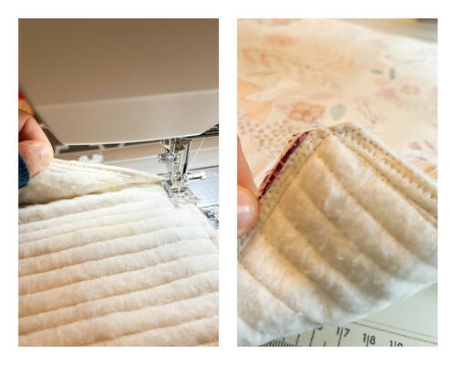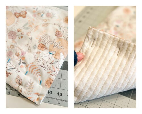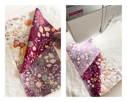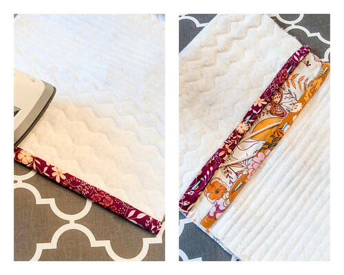 Create the pockets that will hold the journal by folding in the sides from the edges, so the quilted panel now measures 11" x 16".