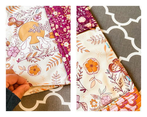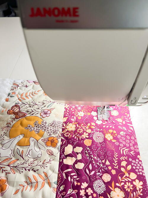 Next place the Fabric 2 piece measuring 5.5" x 11" on top of the center fabric with right sides together, matching raw edges. Attach the piece using a 1/4" seam, flip and use iron or simply finger press open.