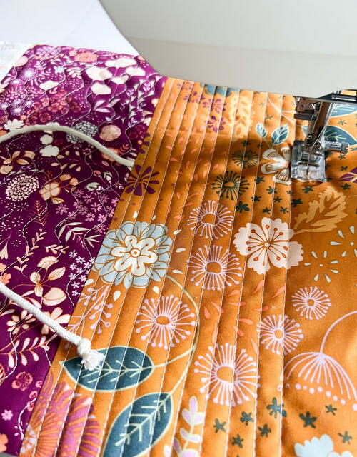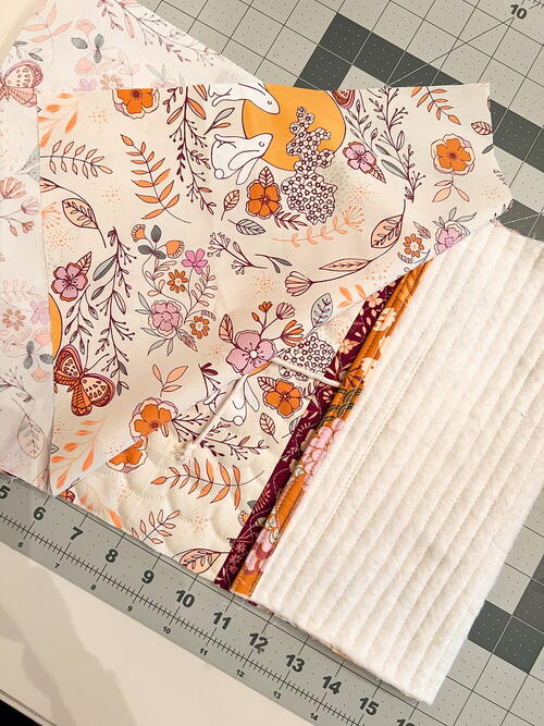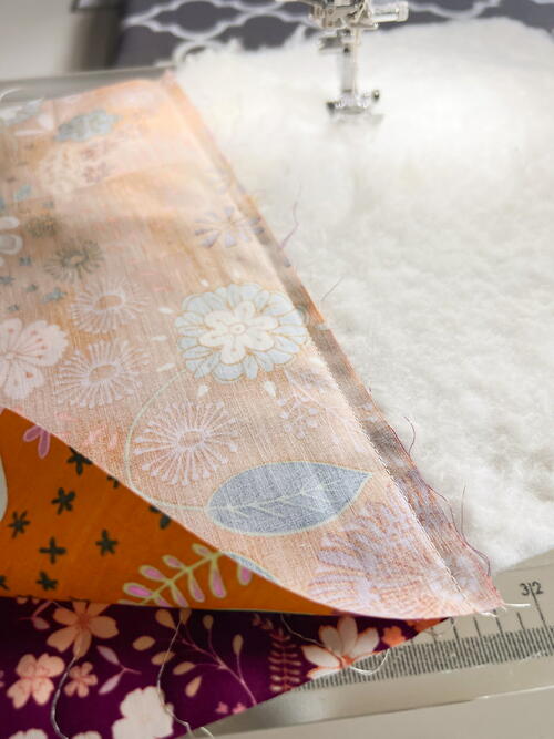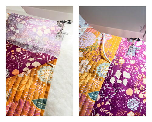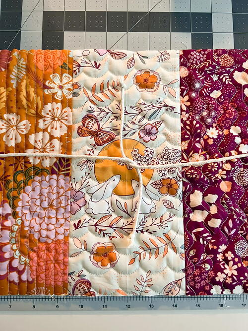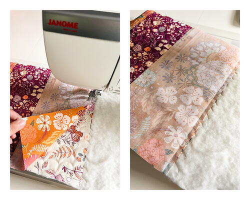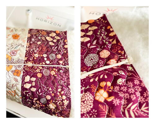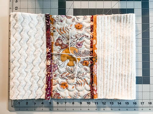 Once this side of the journal exterior is pieced and quilted, turn the batting to begin piecing and quilting the other side in the exact same way. Begin by placing the Fabric 3 piece measuring 5.5" x 11" on top of the center fabric with right sides together, matching raw edges. Continue attaching each piece using a 1/4" seam, flip and press, quilt using the same stitches as you did for the first side. Attach the second tie in the same manner and add the final piece of fabric and quilt to finish piecing the journal exterior.