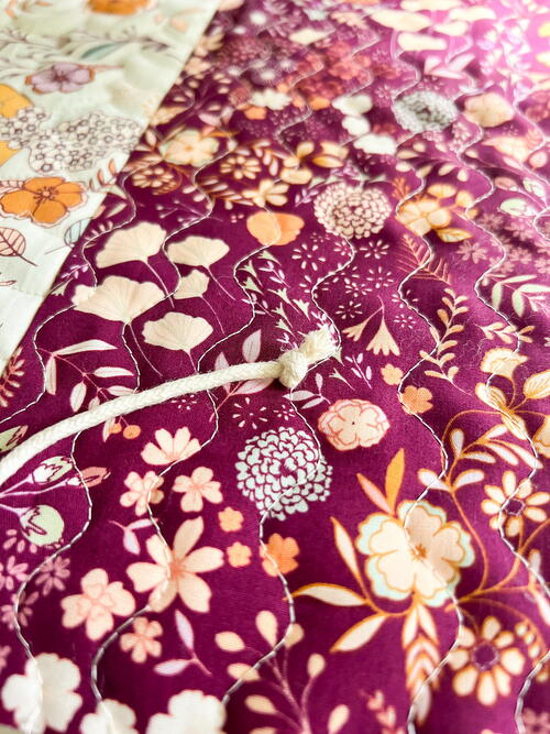 Before adding the next piece of fabric, it's time to add the first tie. Take one 15" length of cotton piping rope or ribbon and knot one end as shown below.