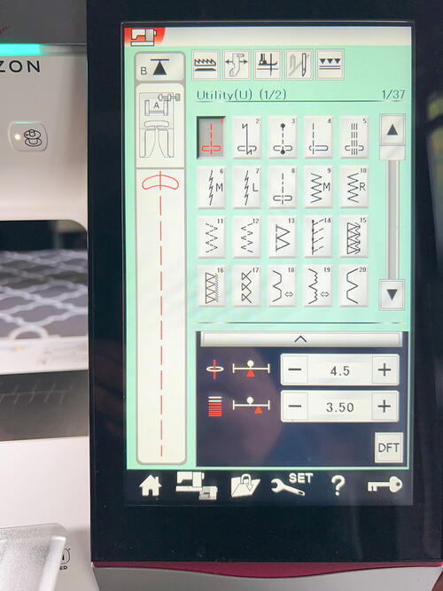 Again, quilt to attach the fabric to the batting. This time I used the simple straight stitch set at a width of 4.5 and a length of 3.5.