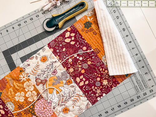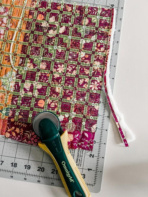 Once the journal exterior is completely pieced, quilted and both ties have been added. Use a mat/ruler/rotary cutter to trim away any excess fabric and batting to measure 11" x 29".