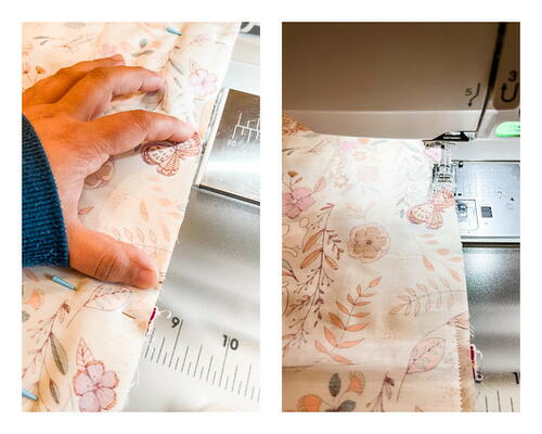 Hem both 11" edges of the quilted journal exterior panel by folding raw edge 1/4" under, then 1/4" under again. Press, pin, and stitch in place using a single or double seam allowance.