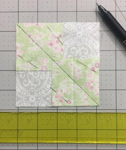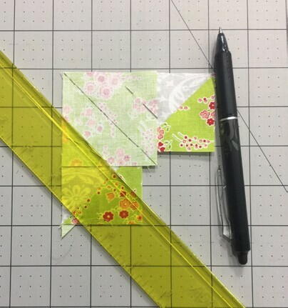 Take the remaining green fabric A 2-3/8” squares and one of the units just pressed, and place the fabric A square in the open corner of the fabric D, RST. Pin in place. Use a ruler and fabric marker to draw a diagonal line from the top left to the bottom right of this square.