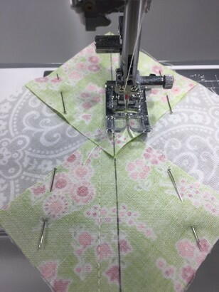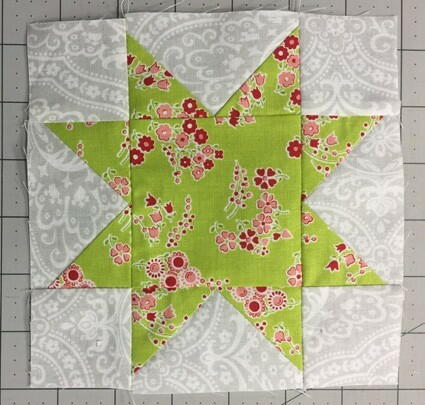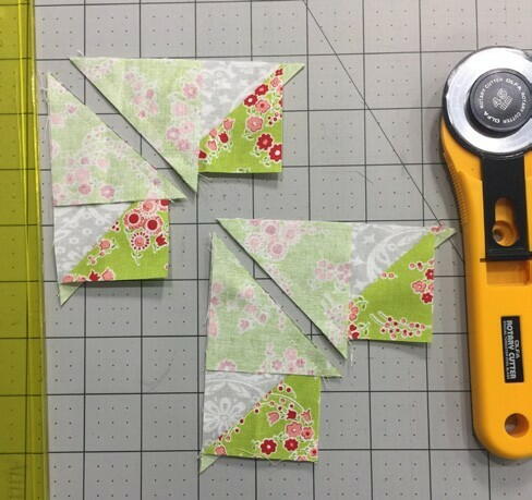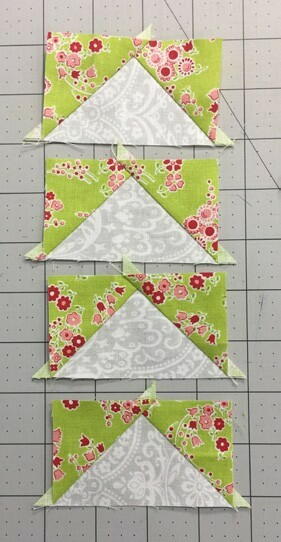 Press the seam away from the grey fabric D to yield four flying geese units.
