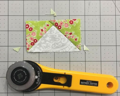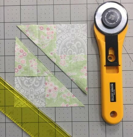 Use a rotary cutter and ruler to cut on the diagonal line previously drawn to separate into two pieces.