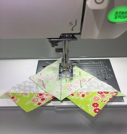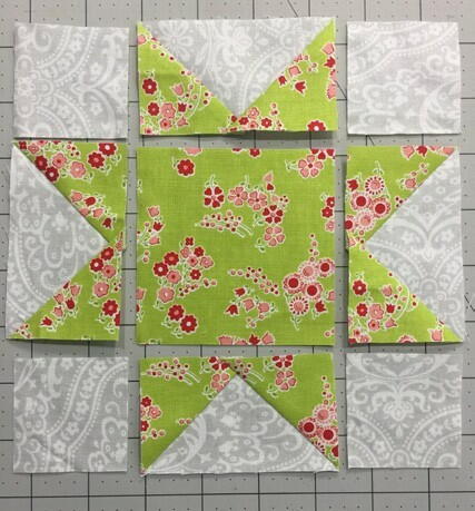 Take the green fabric A 3.5” square and place on a flat surface, RSU. Take the four geese units completed from step 6 and place one directly above, below, to the right, and to the left of the 3.5” square.