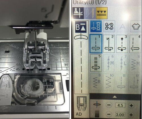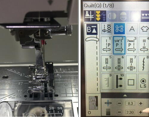 Remove the standard foot A and attach the 1/4” foot O. From the “Quilt” menu, select stitch #2 and change the stitch length to 2.3.