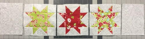 Take the two 4.5” x 6.5” fabric D border pieces and place one to the left of the blocks, and one to the right of the blocks.