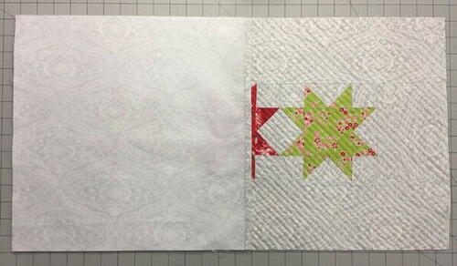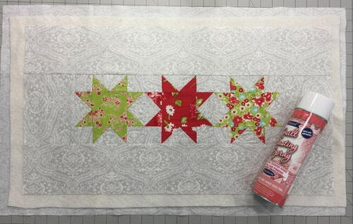 Place the 18” x 30” piece of fabric D right side down and place the 16” x 28” piece of batting centered on top of it. Then place the pieced pillow top centered on top, RSU. Baste the layers together using safety pins or basting spray, following the manufacturer’s instructions.