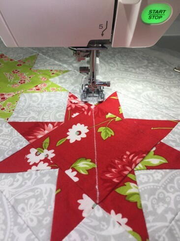 Pin the first border piece to the first block, RST and lining up the 6.5” edges and sew together with a 1/4” seam allowance.