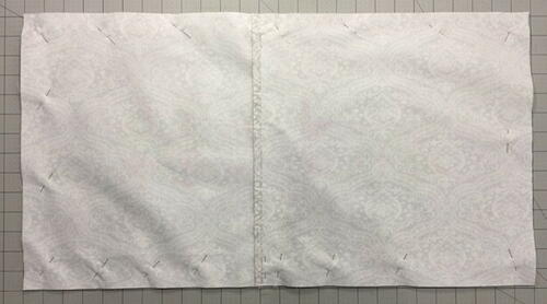 Take the two 13.5” x 15” pieces of fabric D for the back envelope pieces and the coordinating pieces of SF101 and fuse them together (fusible side of SF101 placed together with the wrong side of the fabric D pieces), following the manufacturer’s instructions. Take one of the pieces and on one 13.5” edge, measure and mark 3/4” away from the edge. Fold the raw 13.5” edge of the fabric (WST) over to meet the 3/4” line. Press. Fold again once more to encase the raw edge and pin in place.
