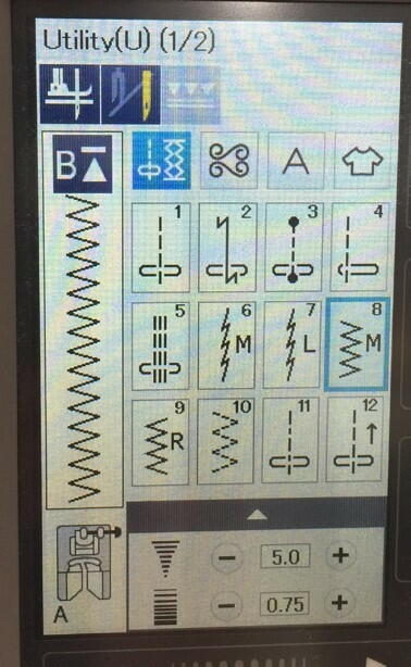 Change the presser foot to the standard foot holder and insert standard foot A. Select the dual feed button again and select stitch #8 and widen the zig zag stitch setting to 5.0 and .75.