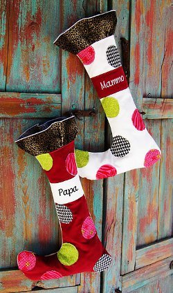 Make whimsical Polka Dot Elf Stockings with this quilted stockings pattern that looks just like an elf slipper! Bright appliqued polka dots, and embroidered name strip, and a leopard print ruffle embellish this fun Christmas stocking.