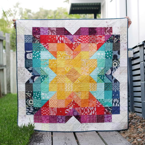 From the designer: "Scrappy Posie is a fast and easy baby quilt, which will help to reduce your scrap pile. This baby quilt finishes at approximately 42" square and features a large flower motif. The pattern looks especially effective in rainbow scraps, although it would also look very classical in a restrained color palette. This is an easy pattern to put together as it is made from squares and half square triangles. The pattern also comes with guidance on how to reduce the block size to give a 21" square block, perfect for a mini quilt or a cushion panel. "