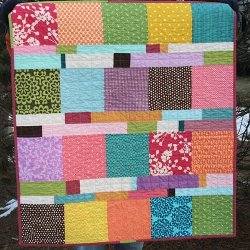 Make this bold, geometric baby quilt pattern with a bevy of bright prints for the next new baby in your life. The Blocks and Stripes Baby Quilt is easily adapted to a stash of good-sized scraps or a layer cake of your favorite fabric line.