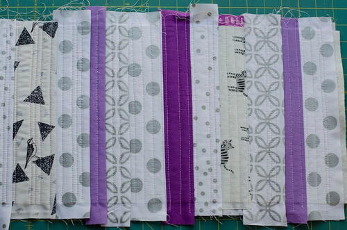 Add the 3rd fabric piece by placing it face down edge-to-edge with the second piece. Piece it down on top of your sandwich as you did in step 6. Press the seam open and add quilting lines as in steps 7 and 8. Repeat until you reach the end of the sandwich.
