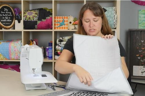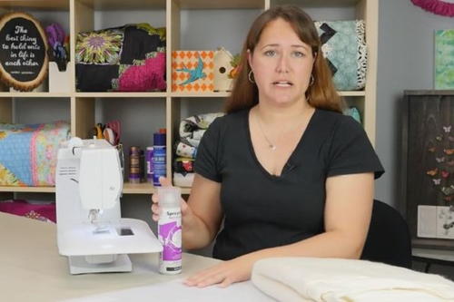 Once you finish your lines, you are going to put the batting inside. Put your backing down face up, your batting in between, and your top will go on top. Use basting spray to baste it.
