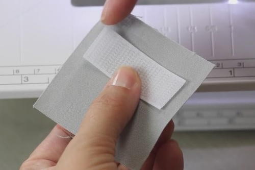 Place a plain fabric square right side down on top of the Velcro on the Velcro-sewn square, leaving the fusible fleece on one side and the wrong side of the fabric on the other side.