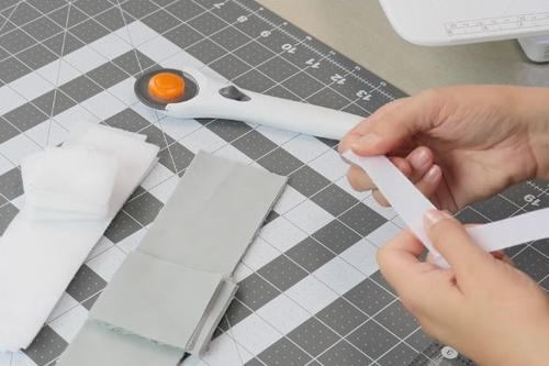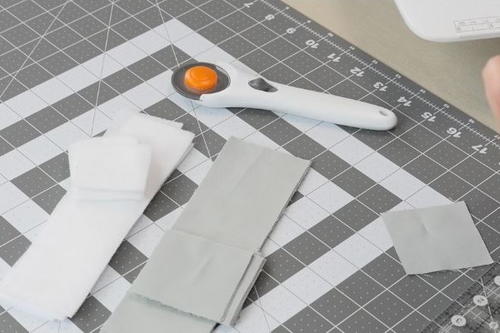 Cut your fabric into 2.5-inch strips, and your fusible fleece into 2-inch strips. Then, sub-cut your fabric into 2.5-inch squares of fabric and 2-inch squares of fusible fleece. -
