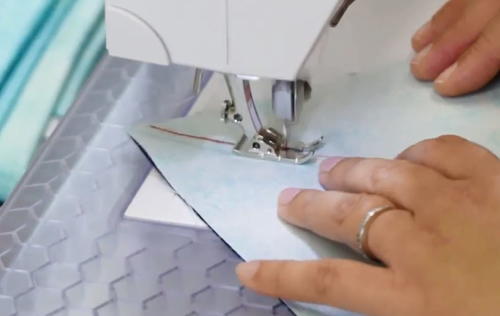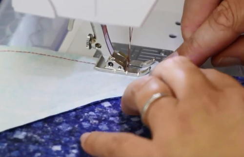 Take these two squares to your sewing machine and stitch a quarter inch allowance on both sides of the line down the center.