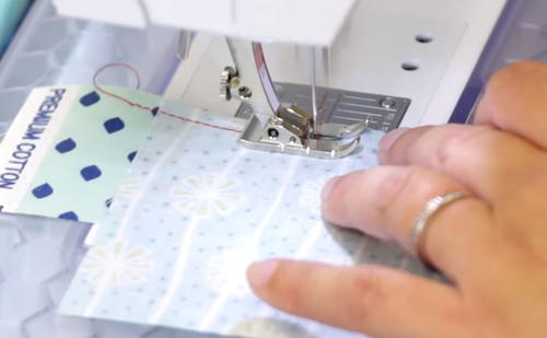 Start your log cabin block but putting one of your light strips next to your center square and stitching with a quarter-inch seam.