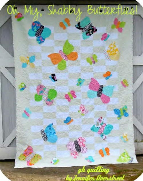 I like the way this quilt uses subdued colors for the pieced part and then uses pretty pastel colors for the appliqued butterflies. The contrast is very nice! It looks to be a fairly easy pattern and the butterflies could be made out of favorite colors of the quilt's recipient. Lovely and fun!