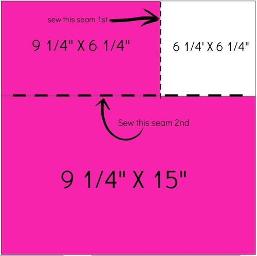 There are two seams to the heart block pictured below. You will sew the background 6 1/4” and the heart fabric 9 1/4” x 6 1/4”, right sides together.