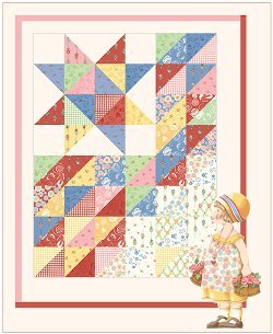 The Basket Full of Turnovers Wall Quilt is a unique design for large wall quilts. The majority of the quilt is made up of large, colorful half square triangles with an oversized patchwork star in one corner. An appliqued cut-out from a fabric panel graces the opposite corner.