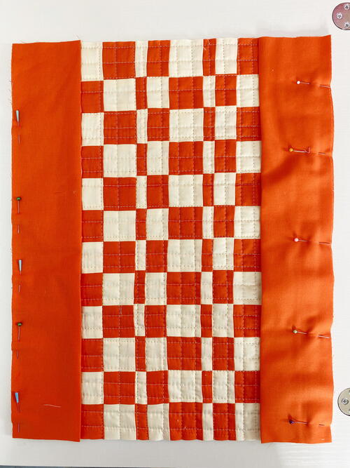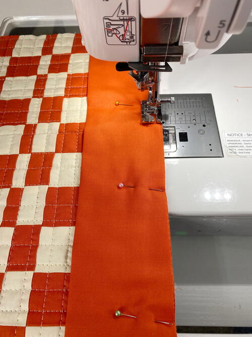 Pin the facing pieces with the raw edges lines up with the quilt edge. Pin and sew down both sides with a ¼” seam allowance.