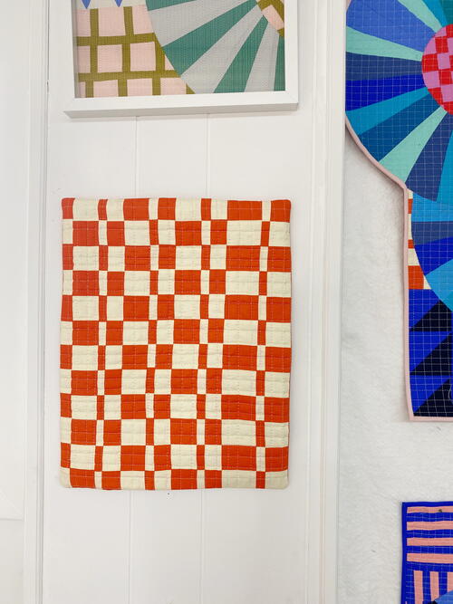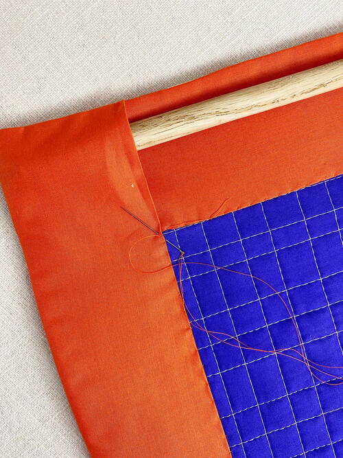 Hand sew the facing down to the back of the wall quilt, leaving the little pockets open. Before you get to the end of the sewing, pop in your cut dowel (it’s difficult to add the dowel after).
