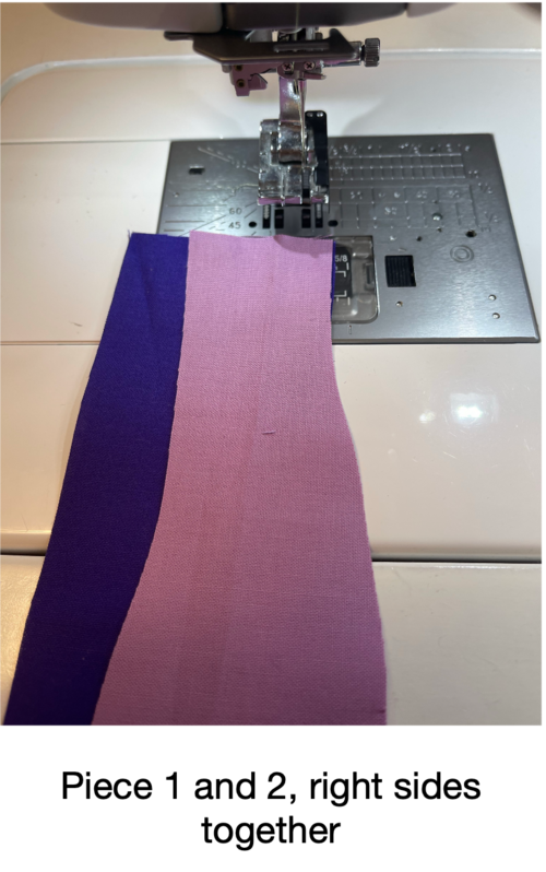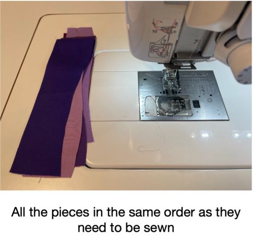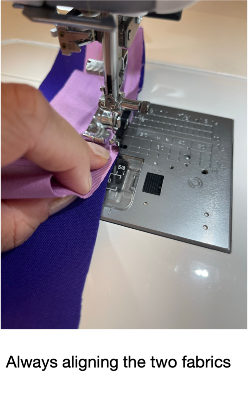 On your sewing machine, start sewing with your 1/4” foot, your first block, sewing in order each piece, always aligning the two fabrics to the edge of the foot. With your left hand handle the fabric on top and with your right hand the fabric on bottom, don’t stretch the fabrics.